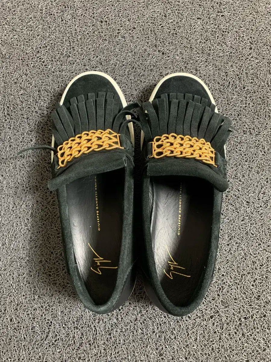 43サイズ ジュゼッペザノッティ メンズ ローファーです。ブラック スウェード 素材に金色 チェーン デザインテープが高級感があります。独特な チェーン 装飾 デザインで POINT として良いです。コメント 無ければすぐ 安全決済していただければと思います!