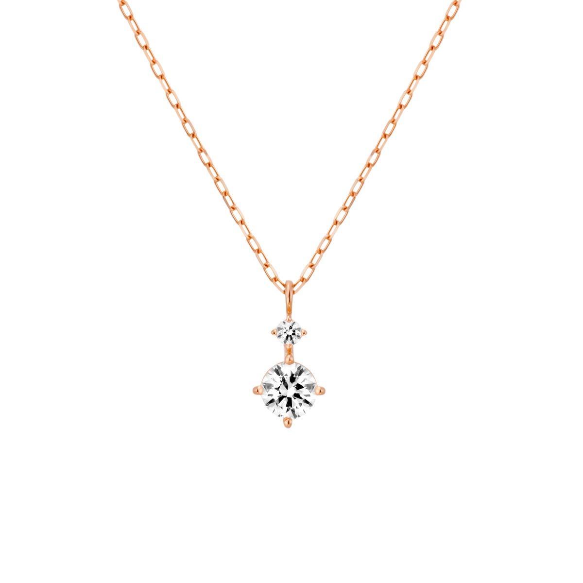 キュービックジルコニアの輝きが際立つ、シンプルなデザインのネックレス。一際眩いきらめきを放つ大きめの1石が、胸元を華やかに彩ります。ピンクゴールドの優しい色合いも美しい、上品なデザインです。