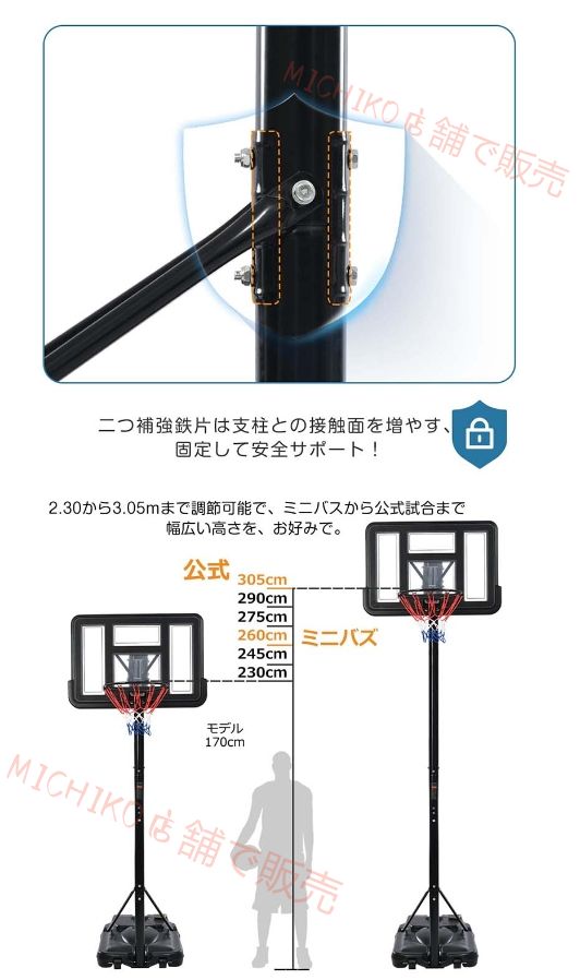 製品説明"工具部品:必要な工具が付き、組み立ては簡単! ご購入の際の注意点: l こちらは組み立てが必要な商品です。 工具はソケットレンチをおススメです。 l こちらは到着後、お客様ご自身で組み立てが必要な商品となります。 ご購入の際の注意点:予めご了承の上、ご注文くださいませ。組み立ては必ず2人以上で行ってください。 l 家庭用とも公式タイプでございます。 ご購入の際の注意点:風や雨の強い日は使用しないでください。 l 295cm以下の場所では使用及び保管はできません。 備考:ボードを含めた高さ:約2.9m~3.65m 天井高が上記サイズ以下の場所では使用保管が出来ません。必ず事前にご確認ください。 ベースタンクに水もしくは砂を入れて使用ください。"