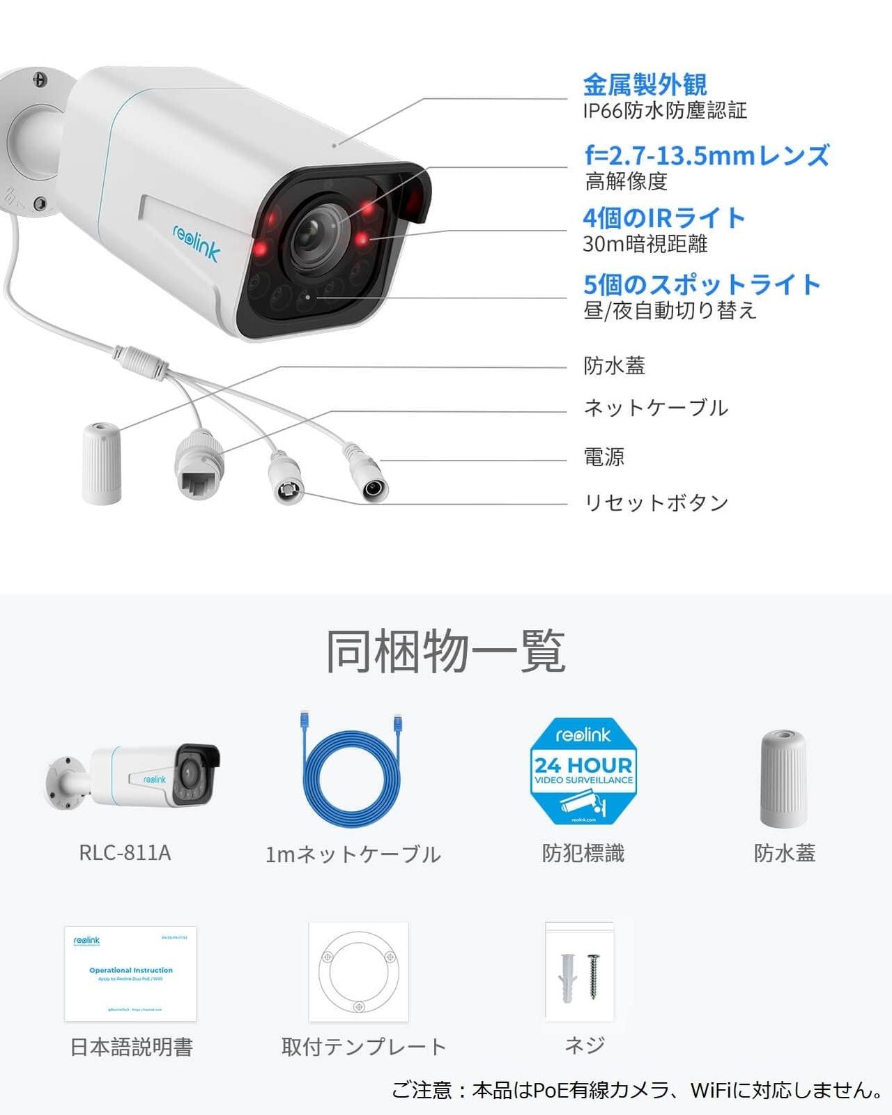 Reolink 防犯カメラ 4K 800万画素 5倍光学ズーム カラー暗視 POE給電カメラ 有線接続 AI人体/車両/動物検知 双方向音声 H.265 IPカメラ ONVIF対応 センサーライト付き 24/7連続録画 遠隔操作 アプリ警報通知 Reolink録画機連携(他社製NVR不可) スマホ/PC対応 お宅/庭/店舗/商業施設 屋内/屋外 IP67防水防塵 RLC-811A