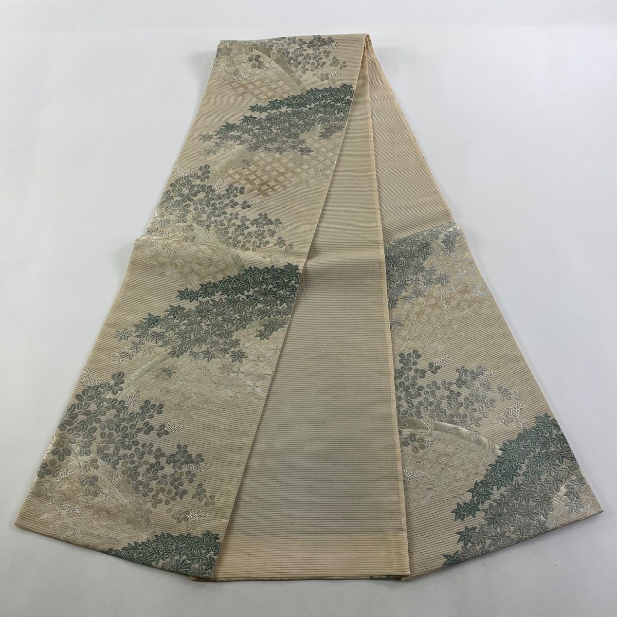 袋帯 秀品 夏帯 絽 萩 楓 銀糸 箔 ベージュ 六通 正絹
