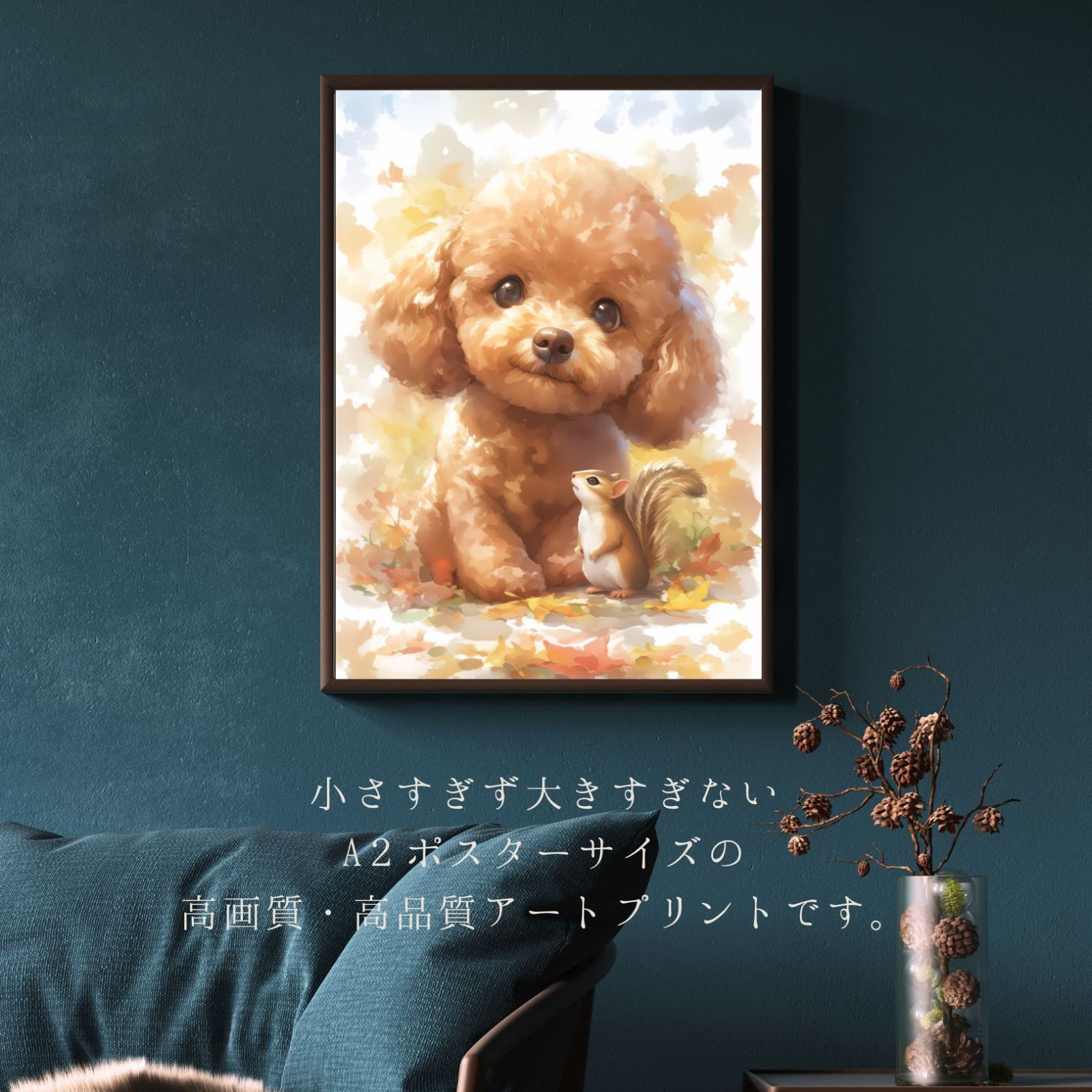 紅葉の秋に栗鼠(リス)と戯れるトイプードル犬(レッド・ブラウン・トイプー)の子犬の姿が可愛すぎるアートポスター作品です。