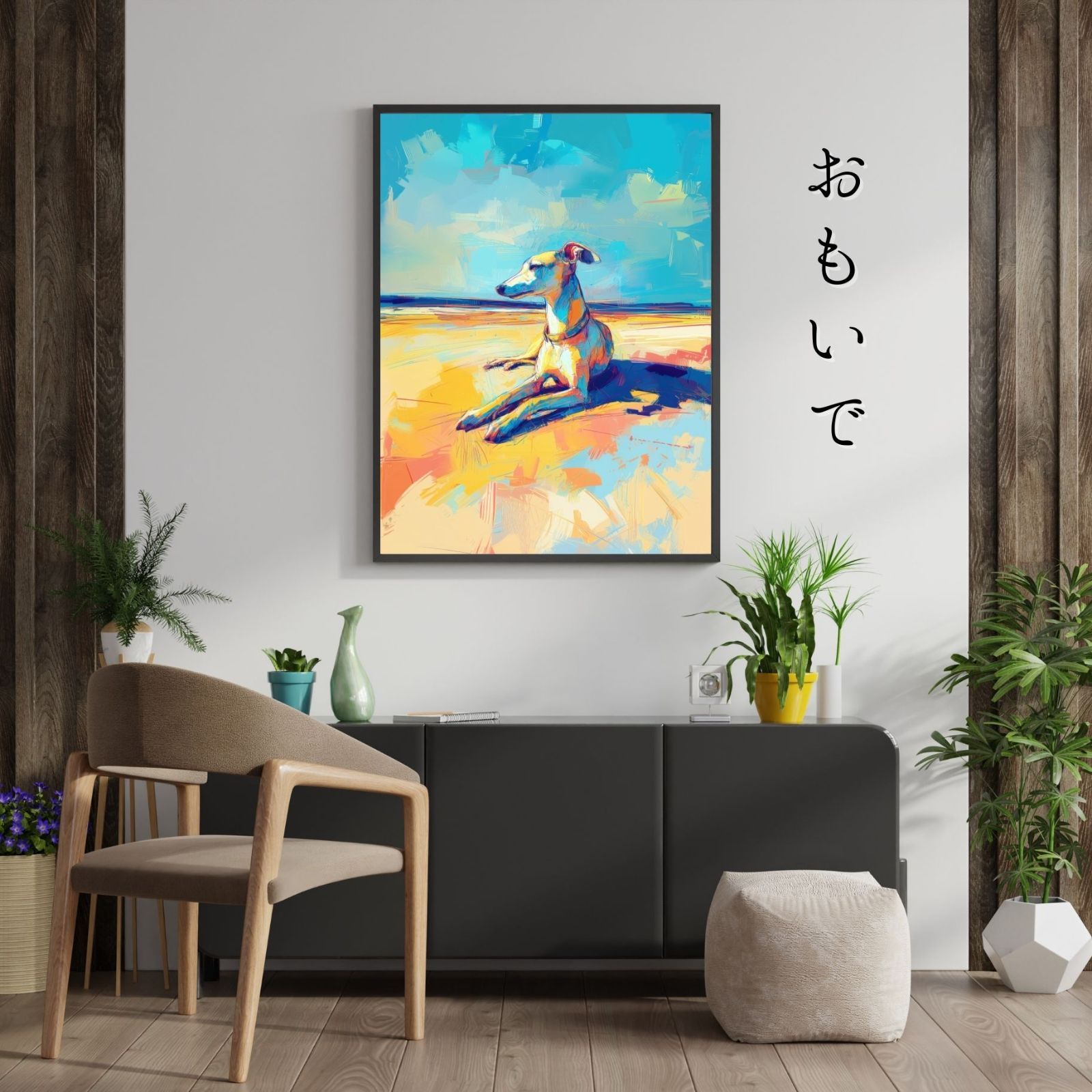 シンプルインテリア空間にピッタリの、海とイタリアングレーハウンド/イタグレ犬のスケッチアートポスター作品です。