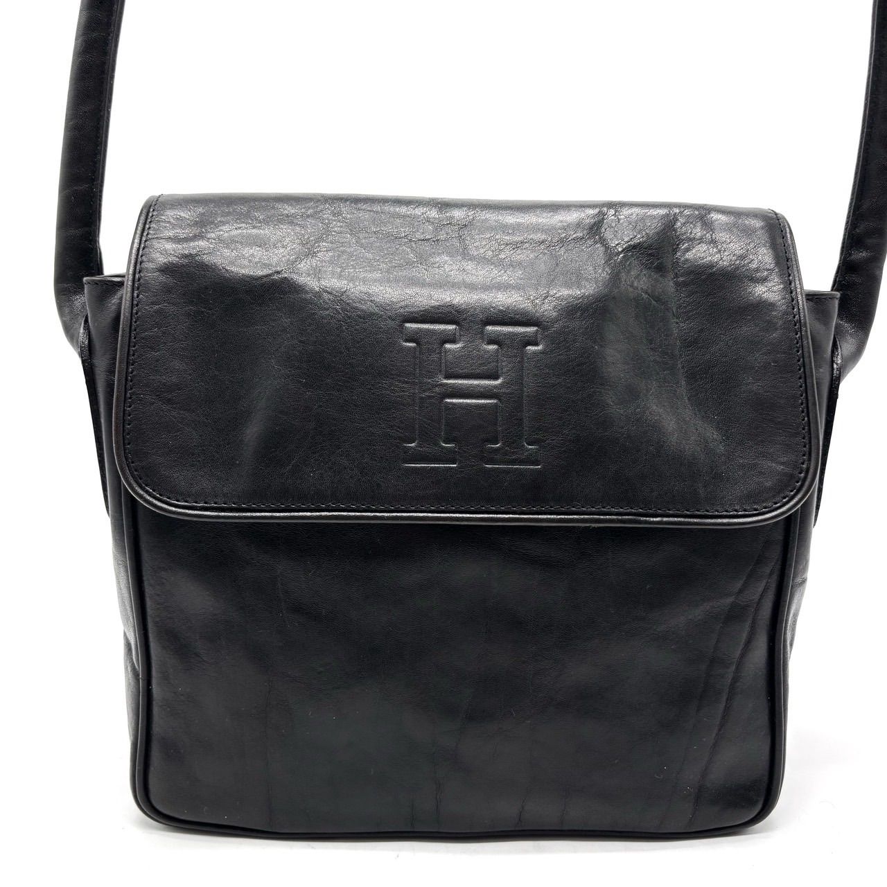 HIROFU ヒロフ ショルダーバッグ トートバッグ ワンショルダーバッグ Hロゴ 型押しロゴ フラップ レザー 革 ブラック 黒色 ユニセックス 男女兼用 メンズ レディース