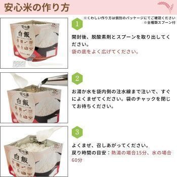 栄養成分・安心米白飯1袋(100g)あたり:熱量368kcal、たんぱく質5.9g、脂質0.8g、炭水化物84.2g、食塩相当量0g
