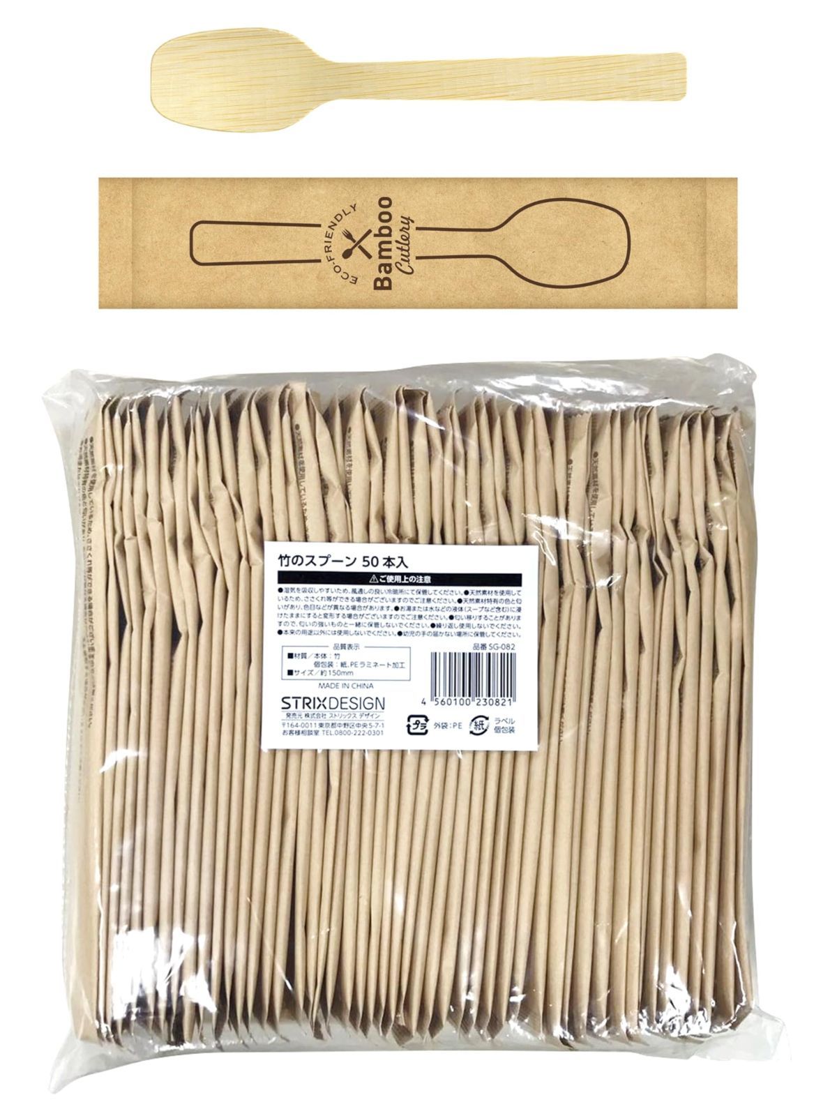 ストリックスデザイン 使い捨てスプーン 個包装 竹 50本 15cm ナチュラル 個包装 業務用 丈夫 環境配慮 SG-082