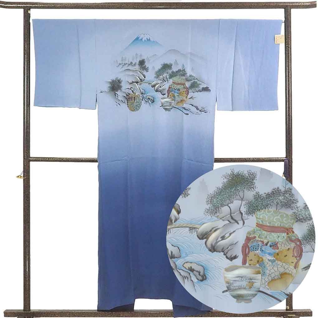 正絹の紳士物袷長襦袢です。定番のブルー地に風景画でカジュアルフォーマル兼用でお使いいただけます。身長180cm前後の方にお勧めサイズです。裄の縫い代は4cm程度ありそうです。