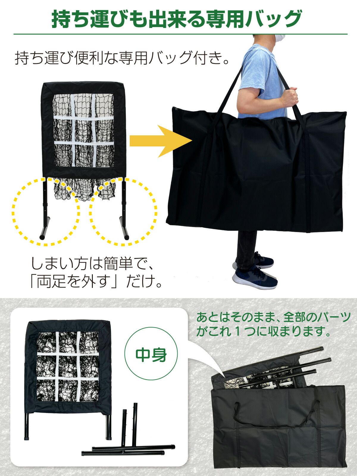【持ち運びもできる専用バッグ付き】収納や持ち運びに便利な専用の袋をお付けします。家で、公園で、練習場で、室内で、足を外すだけで持ち運べるので場所を選ばずお使いいただけます。