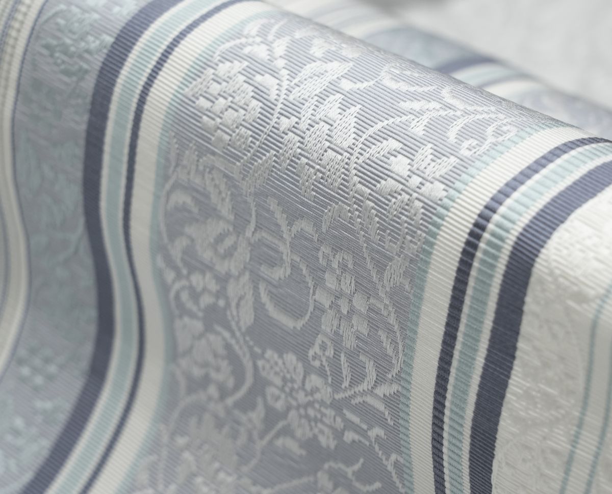 白地にグレー・ブルー縞のお色目で合わせ易い小花更紗の全通柄です。
