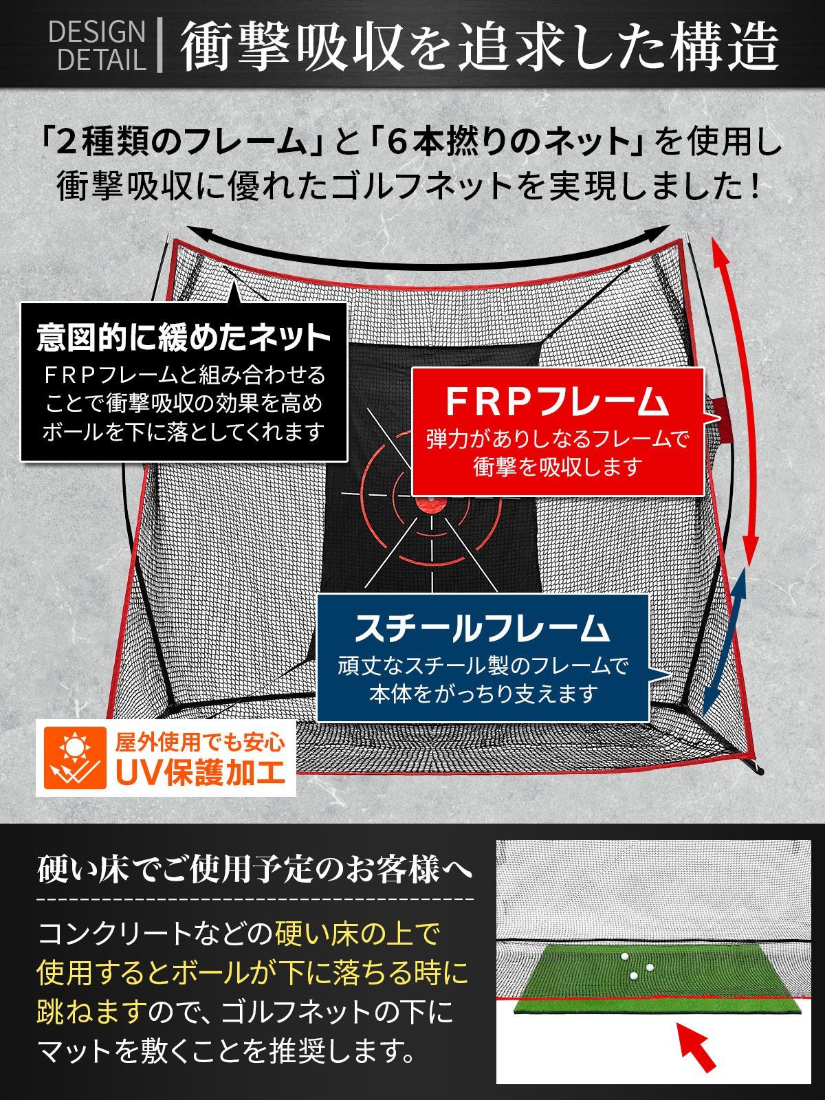 【余裕の大型サイズと衝撃吸収】打ち損じがあっても、ボールが飛び出にくいように余裕のある幅広2.5m×2.4mサイズを採用。また「2種類のフレーム」と「6本撚りのネット」にしたことで、衝撃吸収を追及した構造になっています。