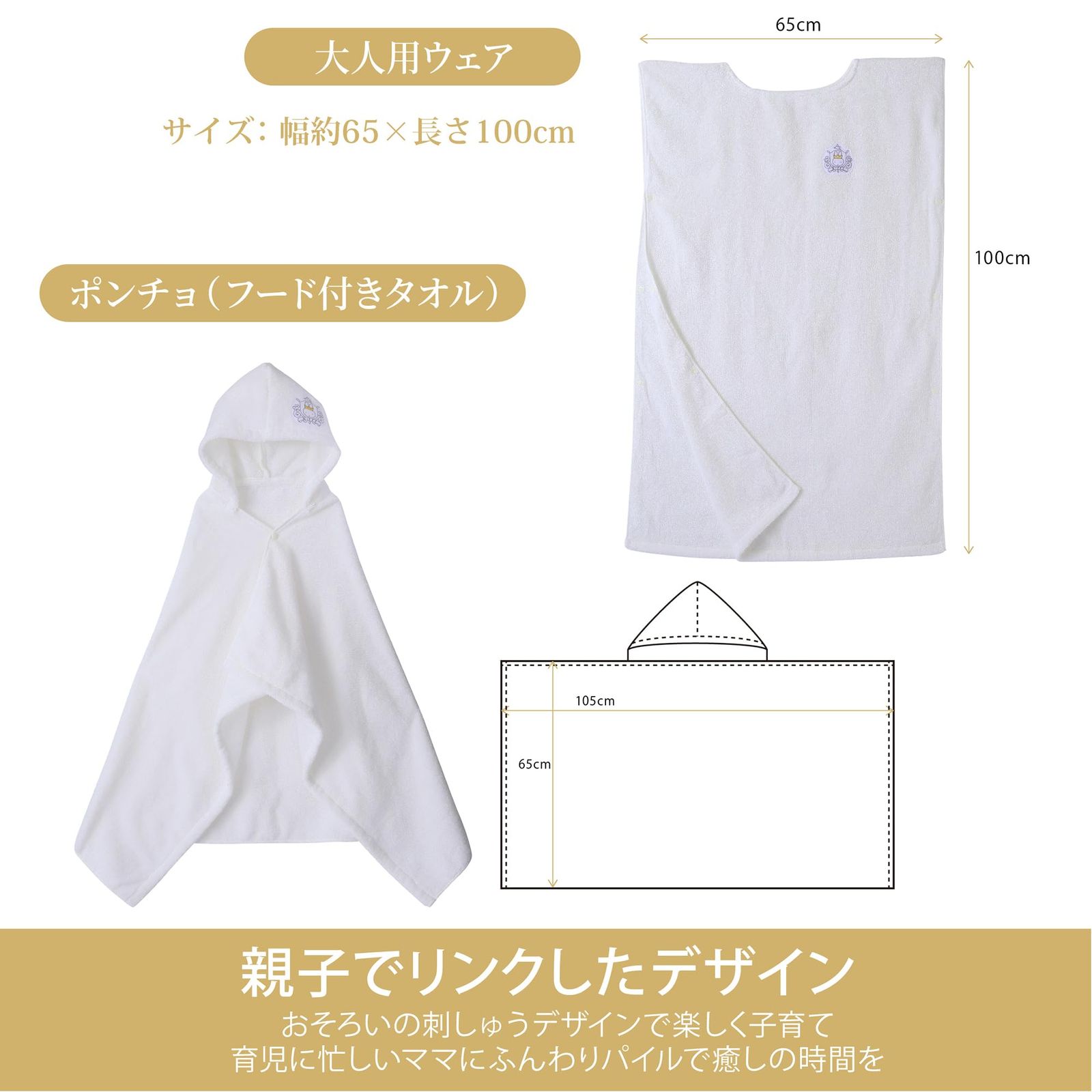 【サイズ】大人用ウェア: 約幅約65X長さ100cm ベビーポンチョ約105X65cm(フード除く)