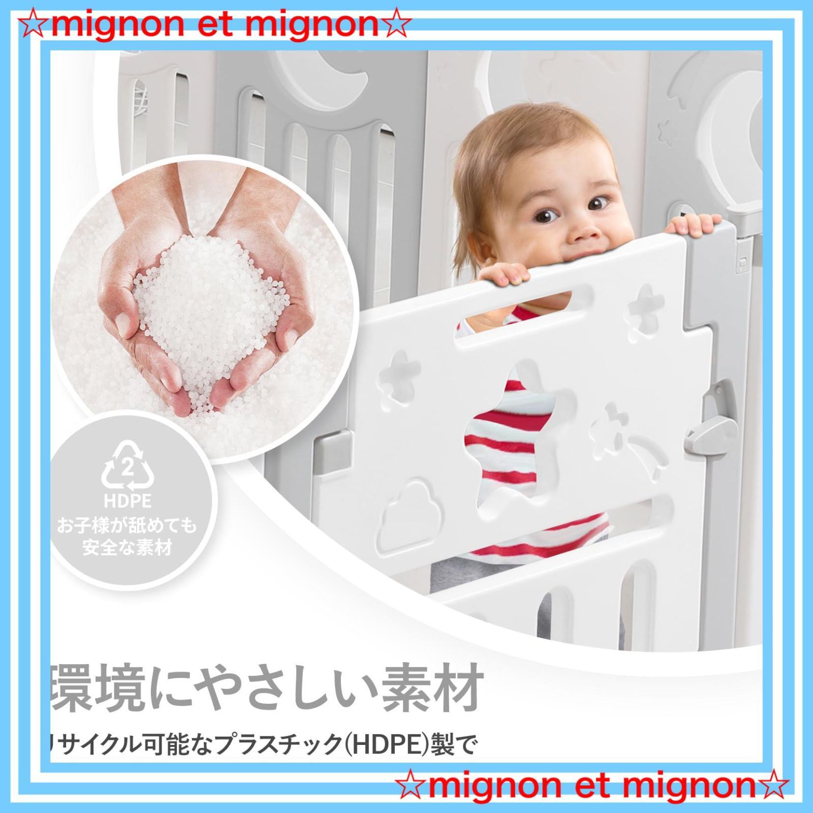 【組み立て&収納カンタン】本ベビーサークルは組み立て時は工具が不要なのでママ1人でも簡単に組み立てることができます。高品質のHDPEで作られているので、木製より軽く、持ち運びやすいです。収納の時、上部ジョイントパーツを引き上げ、全てのパネルをジャバラ状に折りたたみます。ドアパネル・トイパネルが先頭と最後にくるように折りたたんでください。