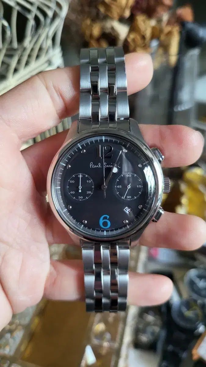 これはポールスミスの男性用メタルクロノグラフウォッチです。シルバーのメタルバンドとブラックダイヤルは豪華です。6時方向の青いナンバーポイントはユニークです。ご不明な点がなければ、すぐに安心してお支払いいただけます!