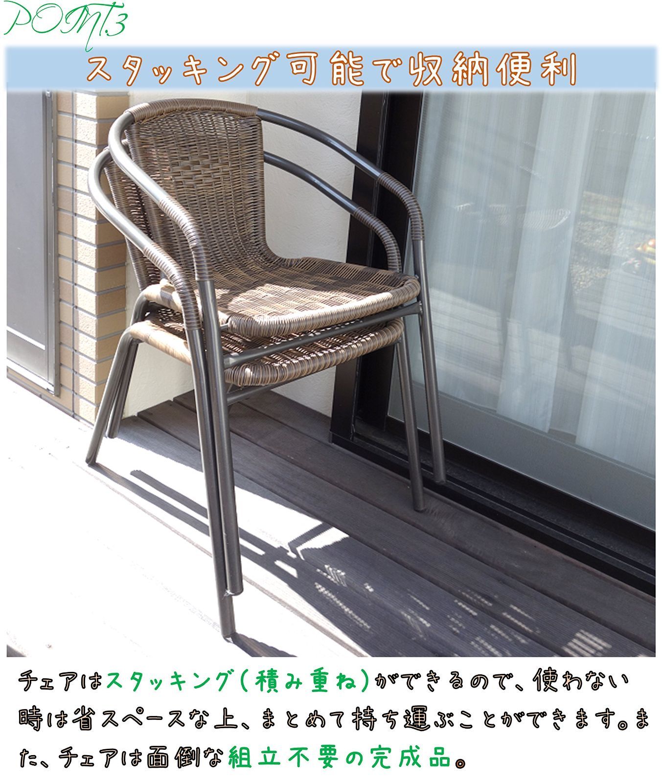 ●ラタン調のオシャレなガーデンファニチャー3点セットがお買い得 ●ガラス天板のテーブルが高級感を演出。本製品を置くだけでベランダやお庭、テラスが一気に華やかに! ●ガラス天板だから、飲み物などをこぼしてしまってもお手入れ簡単。 ●テーブルのみ組立品で組立簡単だから、届いた日からすぐに使えます。 ●チェアは完成品で箱から出すだけ。 ●使わないときは折りたためば椅子をスタッキング(積み重ね)すれば、省スペースで収納ラクラク♪