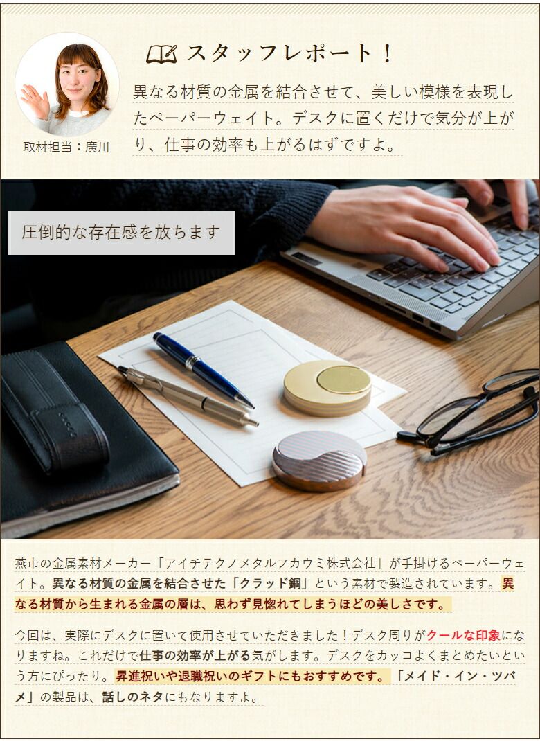 刃物製品に用いられる素材「クラッド鋼」でできたペーパーウェイト。異なる金属素材の組み合わせや、それによって生まれる美しい模様を楽しめます。男心をくすぐるアイテムは、ギフトにもどうぞ!