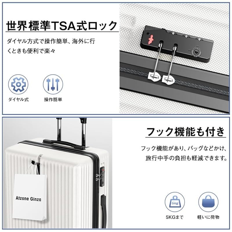 Atzone Ginza スーツケース 大容量 キャリーケース 超軽量 USB充電機能付き 隠しフック機能 トラベルバッグ 耐衝撃 静音 ダブルキャスター TSAローク搭載 ファスナータイプ キャリーバッグ 旅行 ビジネス 出張 入院 1