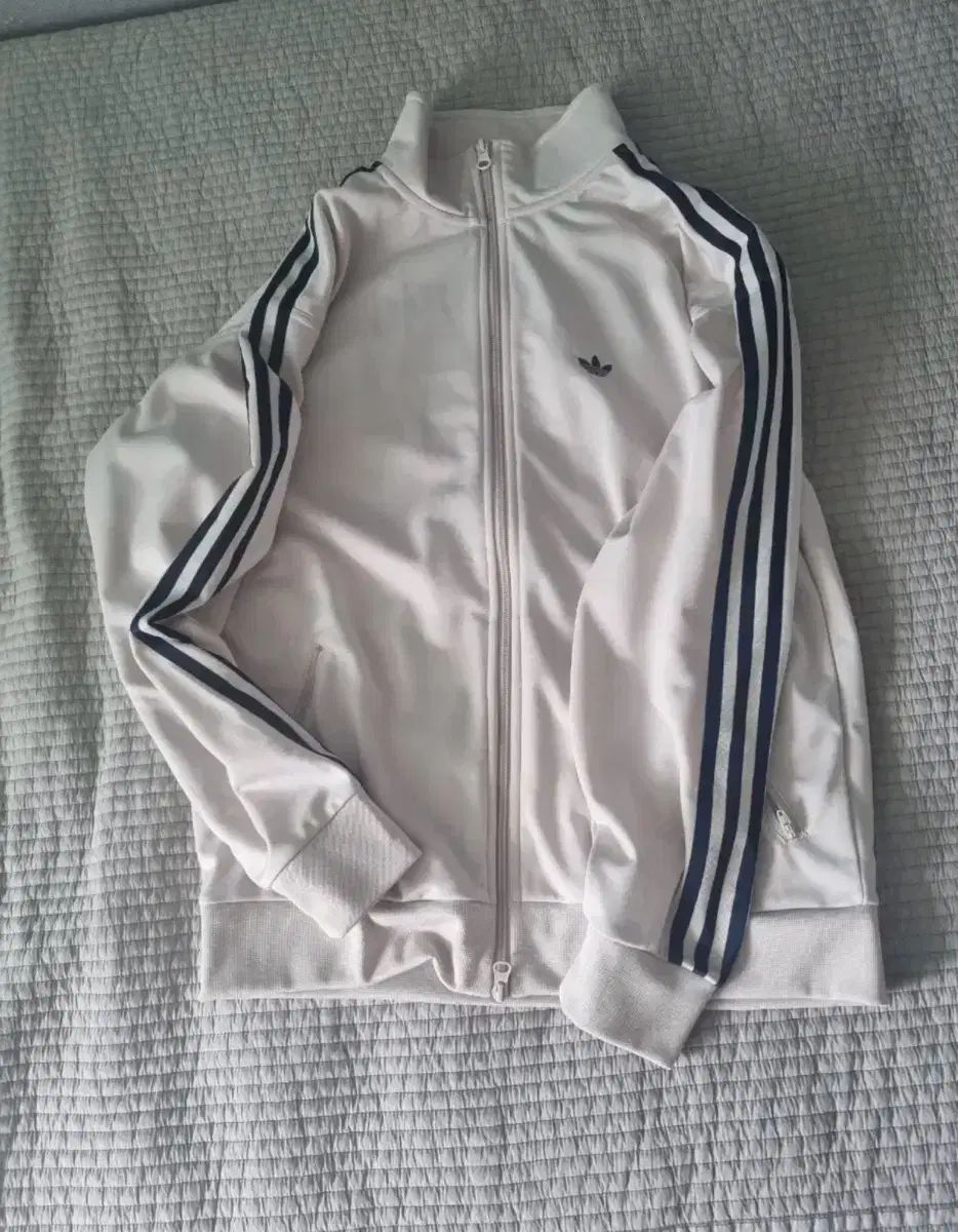 これはアイボリーカラーのアディダススリーライントラックトップです。すっきりとしたデザインはどんな服装にも合います。このアウターは軽くて着やすいです。ご不明な点がなければ、すぐに安心してお支払いいただけます!