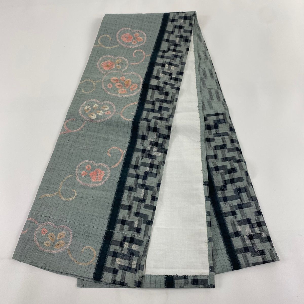 開き名古屋帯 秀品 紬地 草花 唐草 絞り 金彩 灰緑 正絹