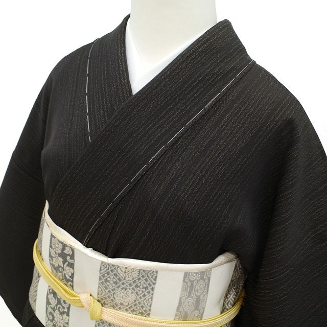 こちらのお着物は、芥子色の縞模様が織り込まれた、シックな黒こげ茶色の地が魅力。