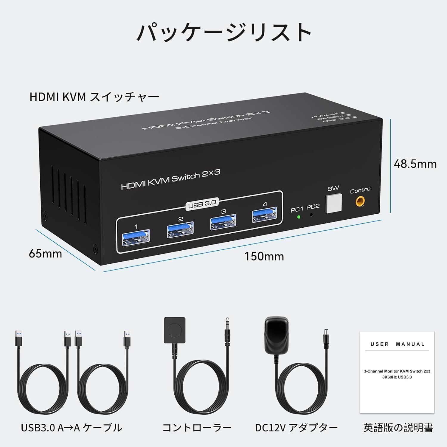 【8K 2PC 切替 3モニター 同時出力】HDMI KVM 切替器 2入力3出力 SW231 USB 3.0 KVM スイッチャー 4ポート 4K 144Hz HDMI 2入力3出力 Swticher モニター スイッチ 2台のコンピューター共有マルチモニターと4つのUSBデバイス用 有線コントローラー付き