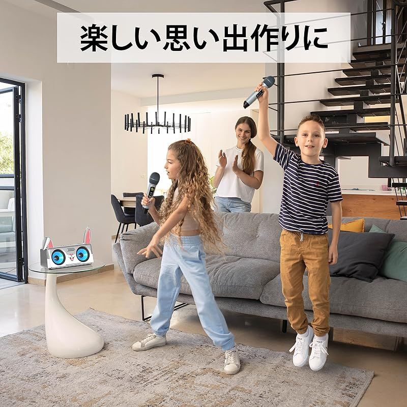 最もクールなカラオケラビットが登場!カラオケキッズたちが最高の歌声を披露するのを笑顔でサポートします。カラオケアクセサリーや機能には、6つの再生オプション(ポータブルPAスピーカーシステムを含む)、2本のカラオケマイク、オート「カラオケモード」、そして励ましの動物顔が含まれています。このキッズ向けカラオケマシンは、ただのカラオケマイクとスピーカーセットではありません。プロフェッショナルなパーティーロッカー、午後の家でのエンハンサー、真の反逆者、そして自信を育むカラオケキング/クイーンです。 - **TV用カラオケ**: RCAケーブルを使用すると、G3のスピーカーからテレビの音声を再生できます。 - **スマートデバイスホルダー**: どんなスマートフォンやタブレットにも対応!G3を小型カラオケマシンに変え、歌詞表示を楽しめます。お気に入りの音楽ビデオチャンネルやアプリをスマートデバイスにダウンロードして、画面にカラオケの歌詞を表示できます。クラシックなKTVカラオケ体験です。 - **柔軟なファンクプレーヤー**: Bluetooth経由でデジタルビジョンをDJし、AUX入力にケーブルを接続したり、親が承認したプレイリストをカラオケ用フラッシュドライブ/Micro-SDに挿入したりできます。 - **デュエットデュエル用デュアルマイク**: ダンスと歌のダブルで盛り上がろう。新しいマイクにはそれぞれデジタルディスプレイがあります。G3はAUXカラオケマイクアダプタやBluetoothカラオケマイクにも対応しています。 - **大音量が好き**: Spintoはよりシャープなカラオケサウンドシステムで、あなたの笑顔の星を応援します。15ワットのアンプが内蔵されているこれらのカラオケスピーカーで、あなたの子どもはブロックを揺らすことができます。 - **家族みんなで楽しめる**: ティーン、プレティーン、幼児、男の子、女の子向けカラオケマシン ? Spinto G3は誰でも楽しめる爆発的な楽しさです! - **どこでもカラオケ**: これは家用のミニカラオケマイクか、旅行用のカラオケセットですか?屋外用のポータブル音響システムか、強力な家庭用カラオケシステムですか?両方とも使えます!Masingoマシンは、アメリカ国内やその他の場所でどこでもカラオケを楽しめます。