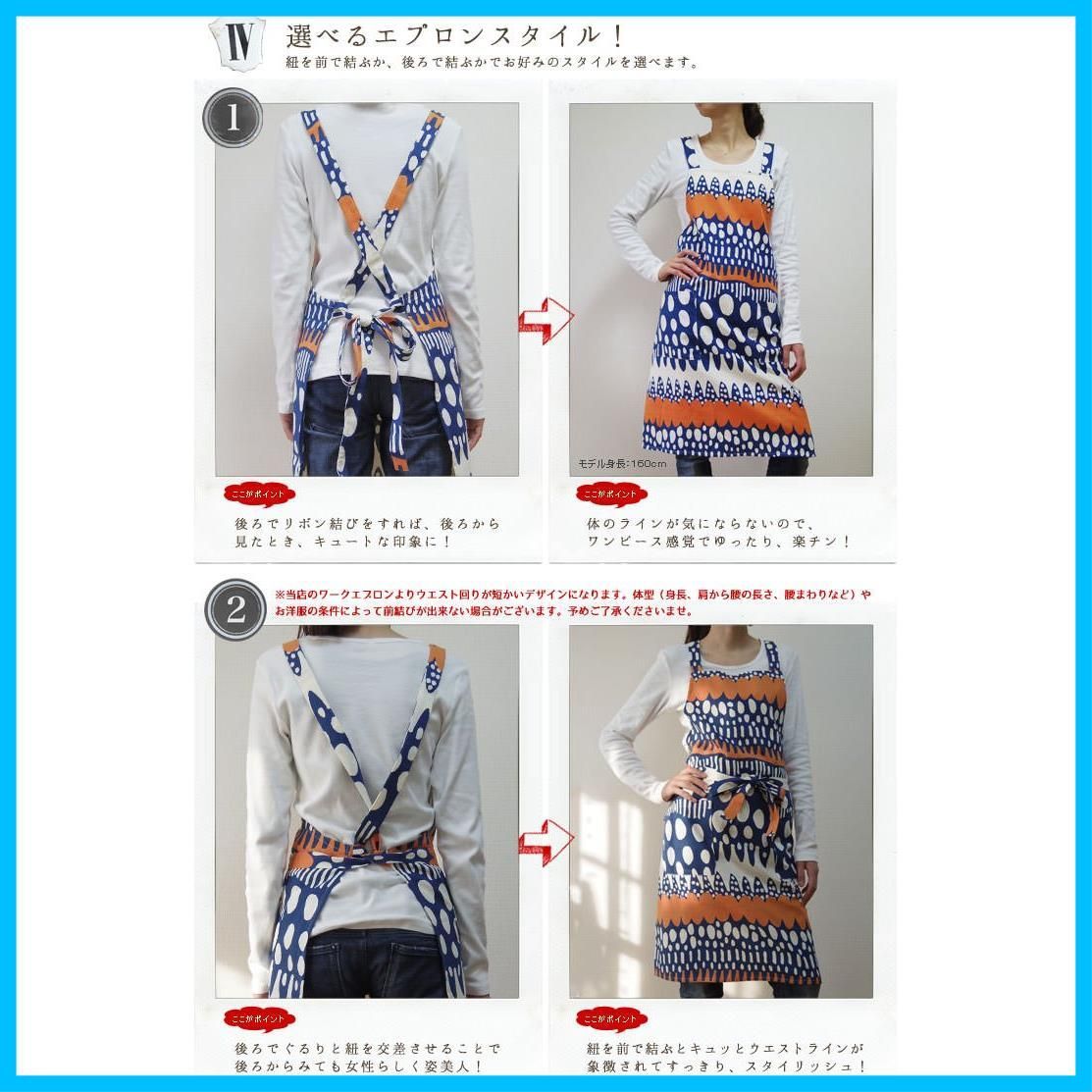 当店のワークエプロンよりウエスト回りが短かいデザインになります。体型(身長、肩から腰の長さ、腰まわりなど)やお洋服の条件によって前結びが出来ない場合がございます。予めご了承くださいませ。