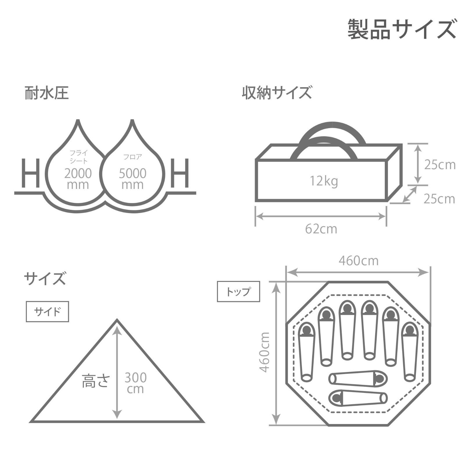 付属品:キャリーバッグ、ペグ×20本、ロープ×8本(テントに取り付け済)