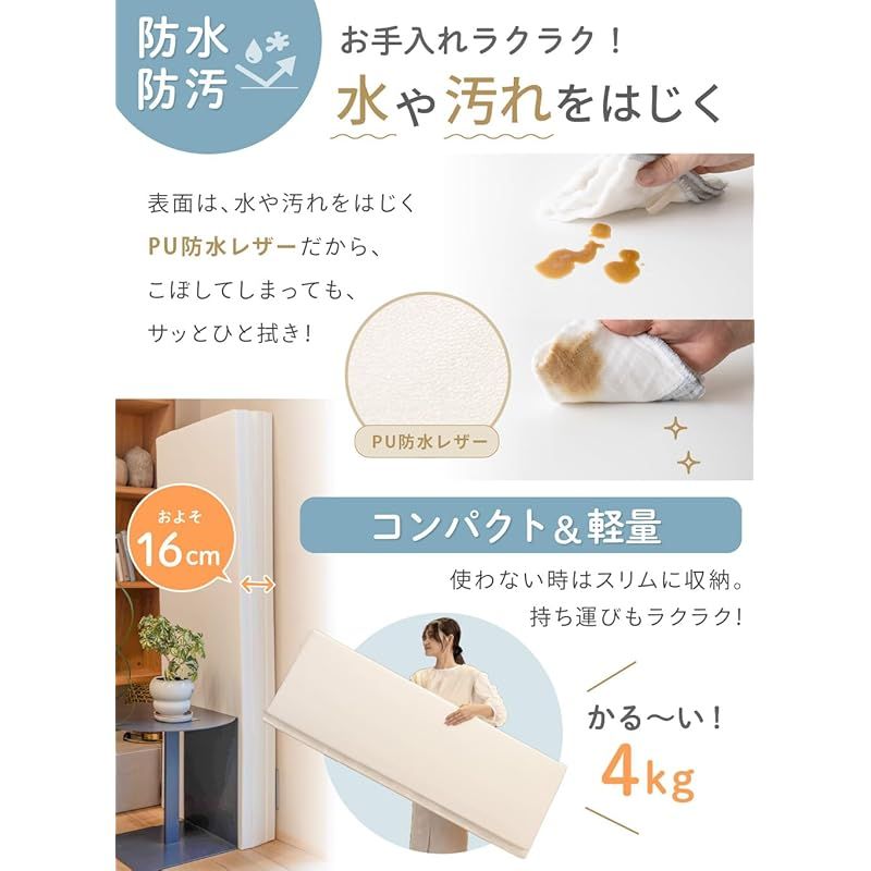【サッとひと拭き♪お手入れ楽々】 プレイマットの表面は、水や汚れをはじくPU防水レザーを採用。食べ物や飲み物をこぼしてしまっても、サッとひと拭きでキレイな状態をキープできます。お手入れも簡単なので、いつも清潔にお使いいただけます。※カバーは防水ですが、カバーの縫い目から水が入る恐れがありますのでご注意ください。※汚れや水分は、長時間放置するとシミやカビの原因になりますのでご注意ください。