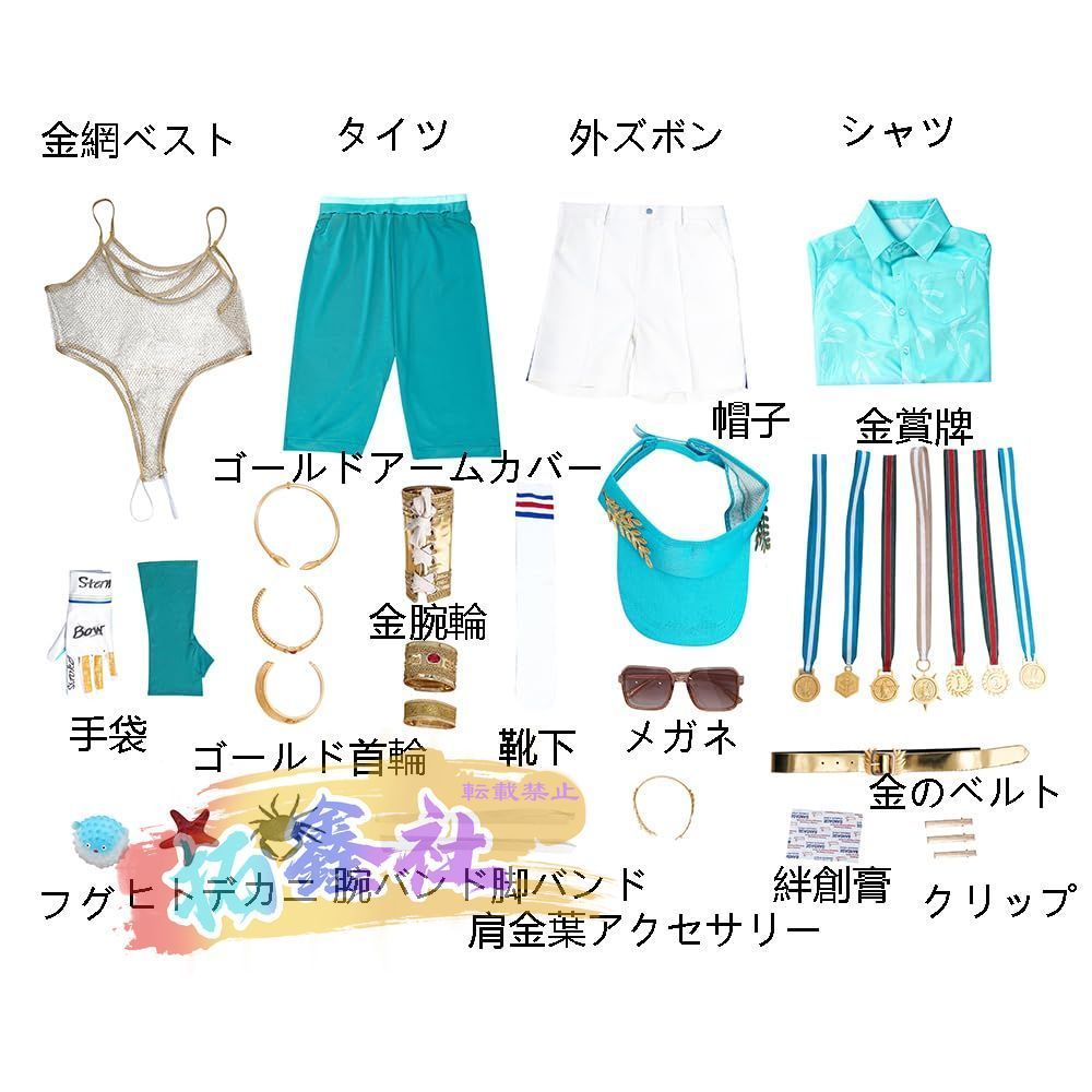 セット内容:「金網ベスト」+「タイツ」+「外ズボン」+「シャツ」+「手袋」+「ゴールド首輪*3」+「金賞牌*7」+「ゴールドアームカバー」 +「金腕輪」+「金のベルト」 +「肩金葉アクセサリー」 +「メガネ」+「帽子」+「カニ」+「腕バンド脚バンド」+「靴下」+「フグ」+「絆創膏」+「ヒトデ」+「クリップ*3」。 品質素材:素材はなめらかな肌触りとソフトな光沢感を持つサテン生地です。さらにプリント柄と異なりのジャカード生地、その凹凸から微妙な陰影があり、また手触りでも感じられる。 セット内容:特に説明がない場合、セット内容は写真の通りすべて含まれています。当店の商品は原作をできるだけ再現するため、衣装の細部までプロが手作りしており、誠意を込めて制作したコスプレ衣装です。 適用場合:コスプレ衣装、日常着、クリスマス、ハロウィン、カーニバル、パーティ、化粧舞踏会、演出、誕生日 プレゼント、学園祭、お祭り、イベント、文化祭、コレクション、撮影など。 信頼保証:当店の目標はお客様に満足できる製品を提供することです。どうぞご安心に購入ください。万が一、不良品・欠陥品が届いた、あるいはアクセサリーが入ってない場合、当店とご連絡いただければ幸いです。至急にご対応いたします。