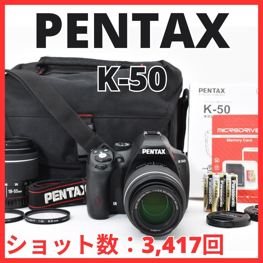 J23[6991]17★極美品★ ペンタックス PENTAX K-50 ボディ 18-55mm 50-200mm ダブルレンズセット ダブルズーム 【ショット数 3,417回】