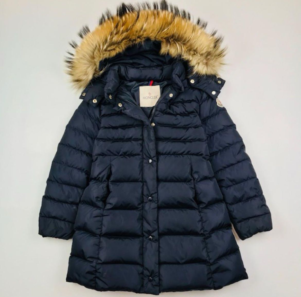 MONCLER★モンクレール・NEW_NESTE_ ガールズ キッズ ワッペン ラクーンファー フード付き シャイニーナイロン フルジップ ダウンコートです。全体的に状態は良いですが 襟部 裾部 腕部 袖裏地 裏地やや汚れがありますので写真でご確認下さい。ボディーに上質で光沢のあるシャイニーナイロンを使用しフロントをフルジップで仕上げた 高級感溢れるダウンコートです。左腕のアイコンワッペン ラクーンファーがポイント‼︎ フード ファー共に脱着可能です。今では入手困難なモデルで色々なシーンやこれからの季節に最適です。