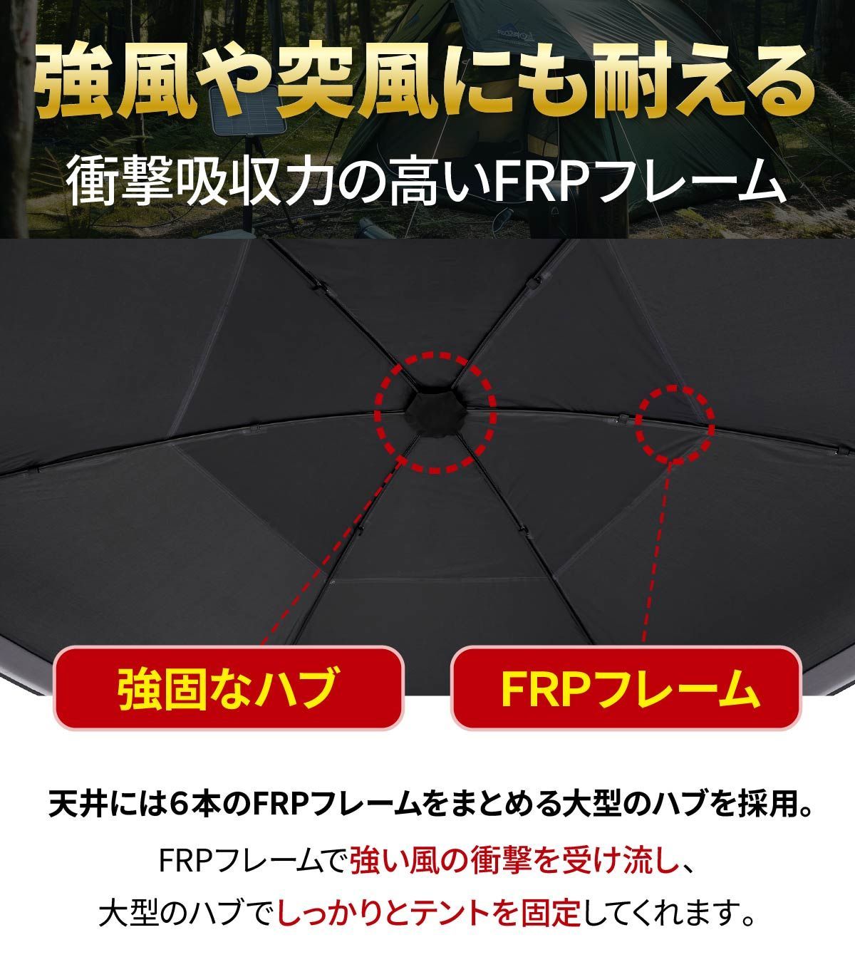 【最大8人まで入れる広々六角タイプ】広々とした大型タイプのため、テーブルや椅子などを置くことが出来ます。出入口は左右にも開いて留めることが出来るので、荷物の運搬や出入りが多い時などに便利です。ジッパーは大型の両面ジッパーだから外からも中からでも開閉しやすい!