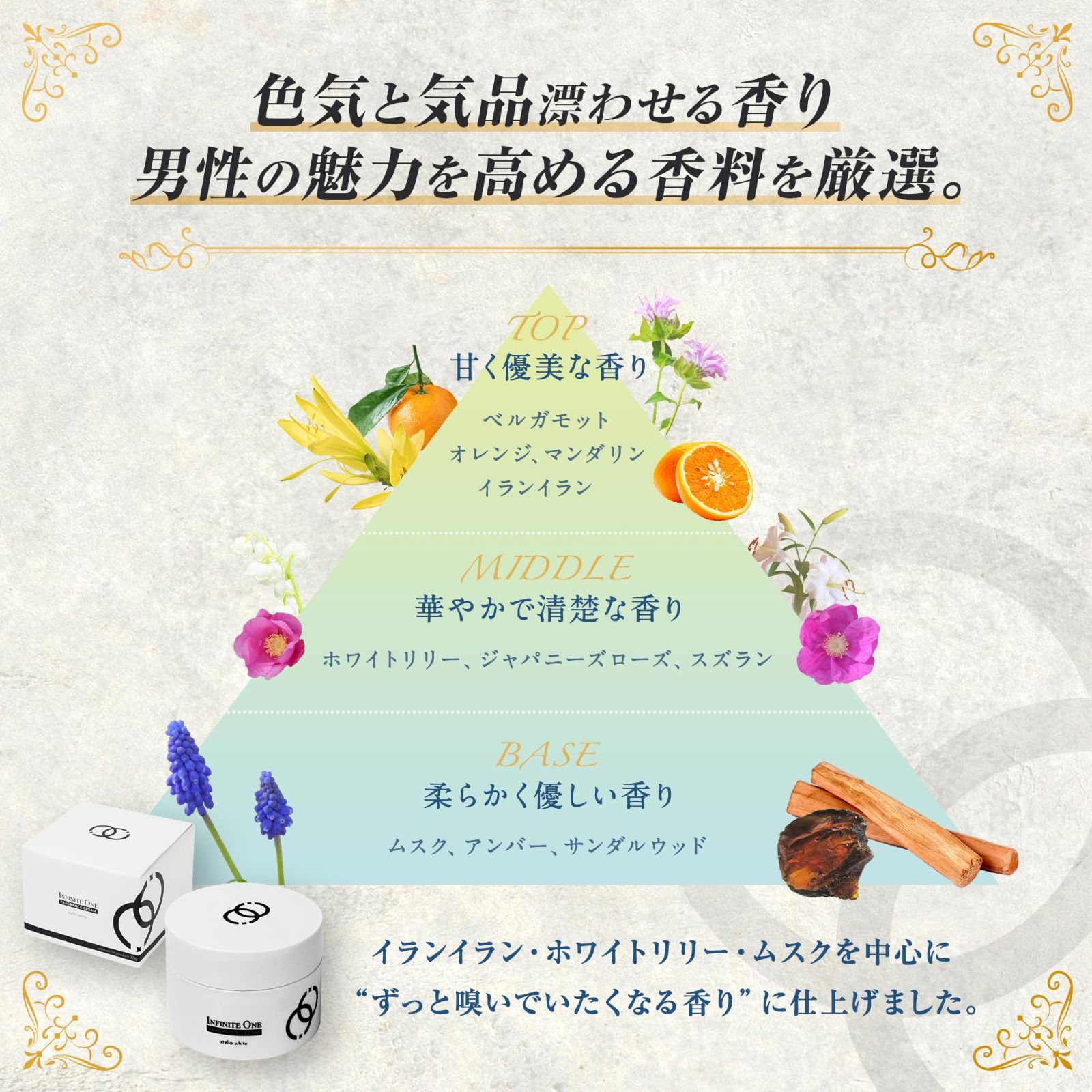 男性の魅力を最大限引き出す インフィニットワンステラホワイトは女性を興奮させるモテフェロモン『アンドロスタジエノン』に着目し作られた練り香水になります。 香りで記憶させ、無限(インフィニット)にあなたのことを考えてしまう 実は女性の多くは視覚ではなく感覚で異性を見極めていると言われています。 つまり顔やスタイルではなく、香りという目に見えないところに魅力を感じるのです。 男性の魅力的なポイントは? ※自社アンケート調べ 1位匂い 2位顔 3位身長