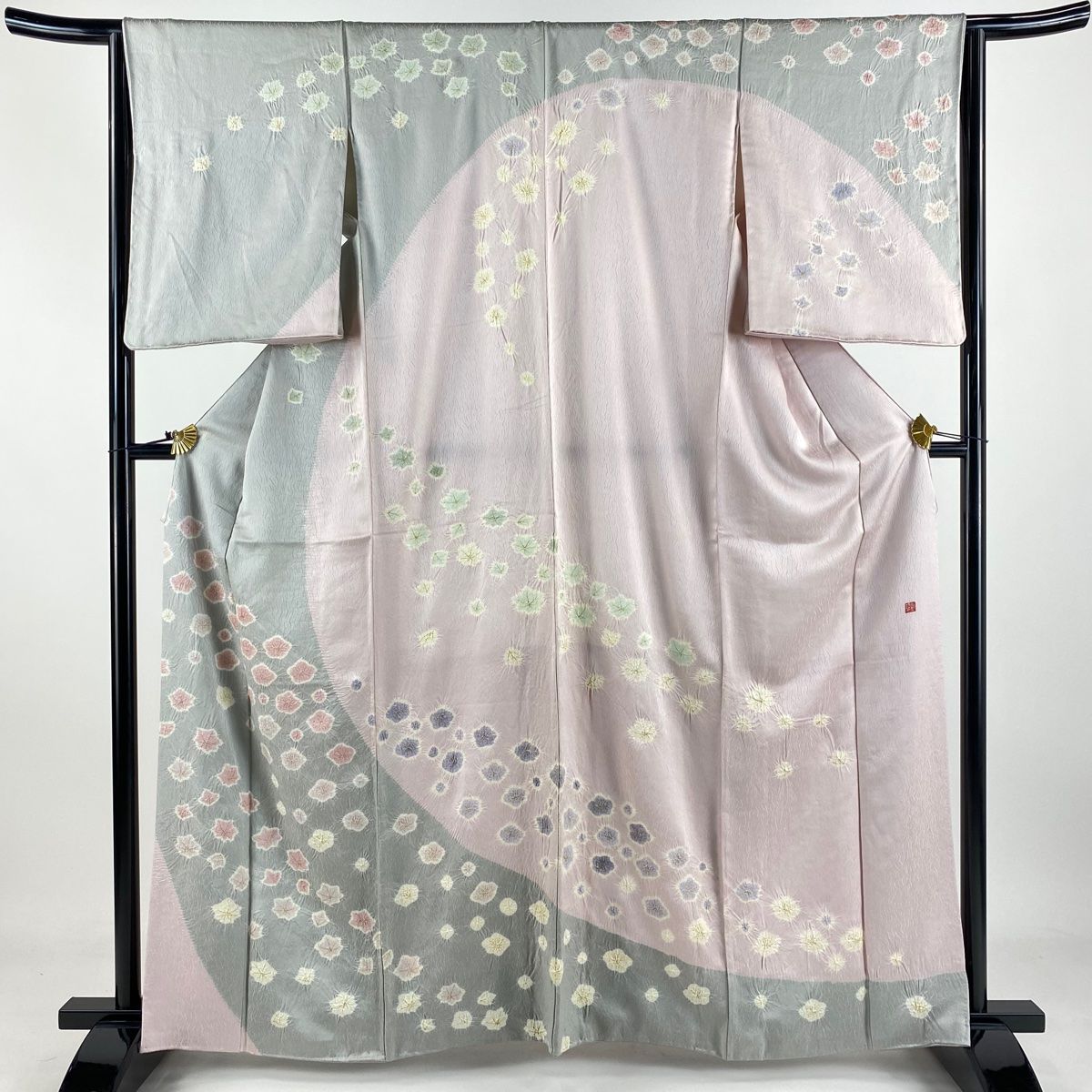 訪問着 身丈163 cm 裄丈64.5 M 袷 奇翠 青柳 落款 梅 楓 金彩 絞り 灰色 正絹