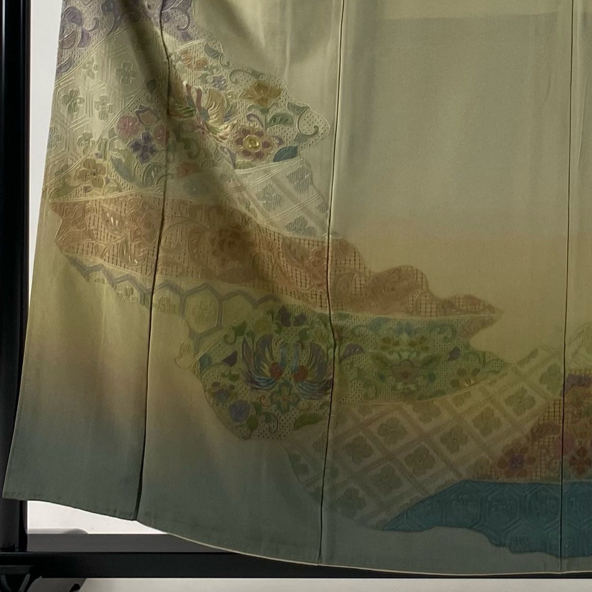 訪問着 身丈158.5 cm 裄丈62.5 S 袷 向かい鳥 草花 汕頭刺繍 ぼかし 灰緑 正絹 秀品