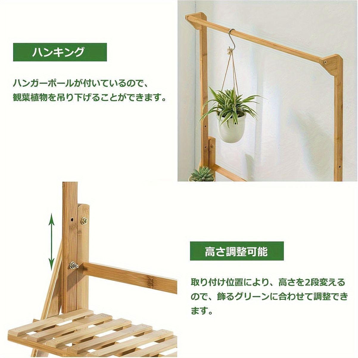 吊り下げスペース付きで、鉢植えや多肉植物、プランターを立体的にディスプレイ可能。