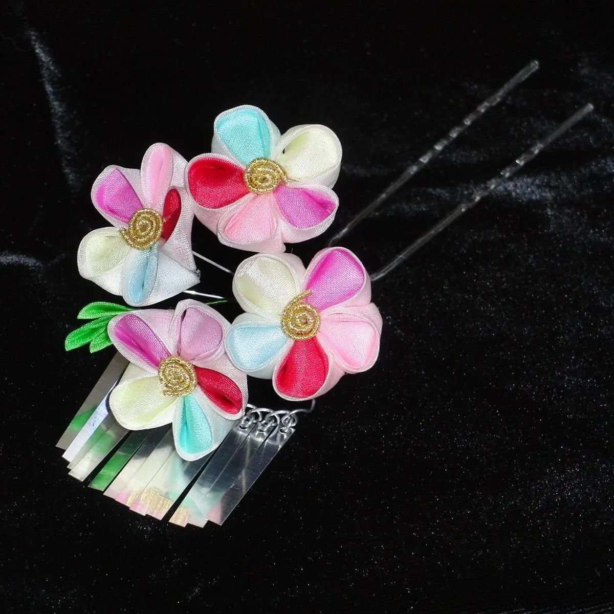 正絹羽二重のつまみ細工で作ったお祝い用3点セットの簪。