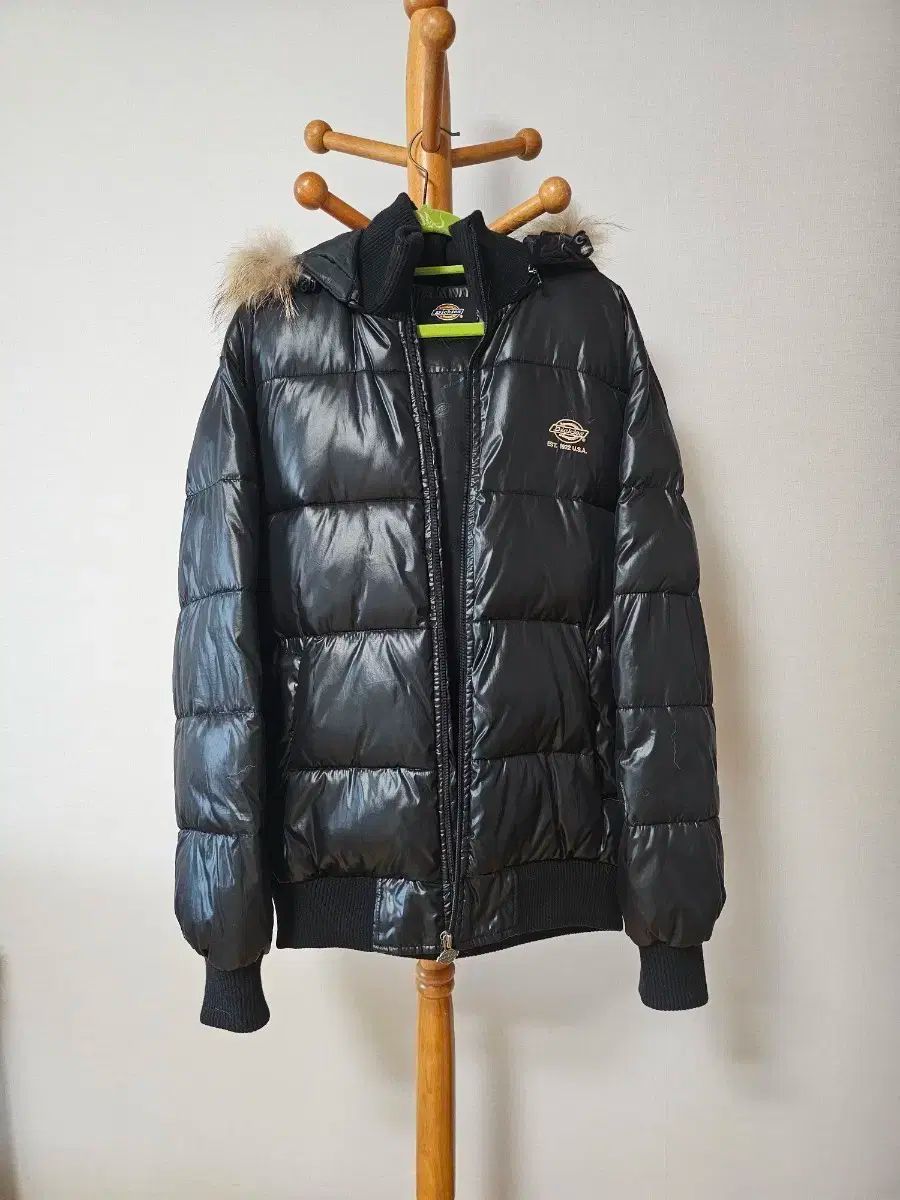 ほんのりとした ブラック 光沢感に ファー トリミング フード、後ろ側 ‘Dickies’ 刺繍 POINT が 特徴 です。