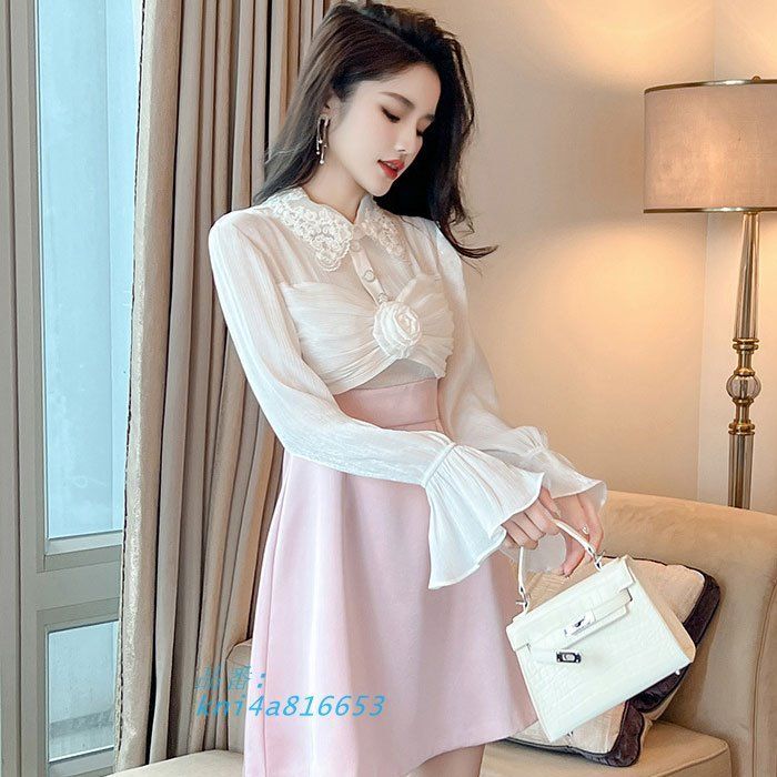 シースルーベルスリーブ長袖 ハイウエスト切り替えショートフ ワンピース 白×ピンク かわいい レディース 服 韓国 kni 4 a 816653