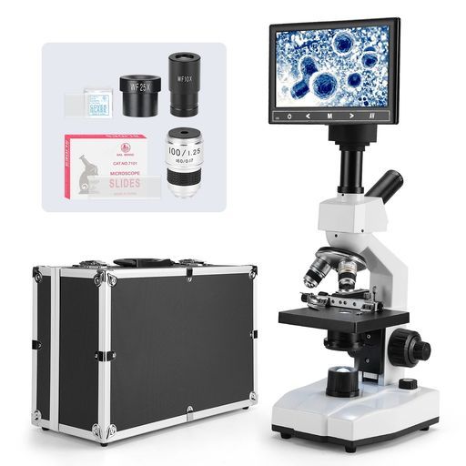 Vabioothデュアルビュー実験室単眼式生物顕微鏡40 X-2500 X倍率 7インチ液晶ディスプレイ 広視野 接眼レンズ 可調節メカニカルステージ アルミニウム製持ち運べるボックス日本語取扱説
