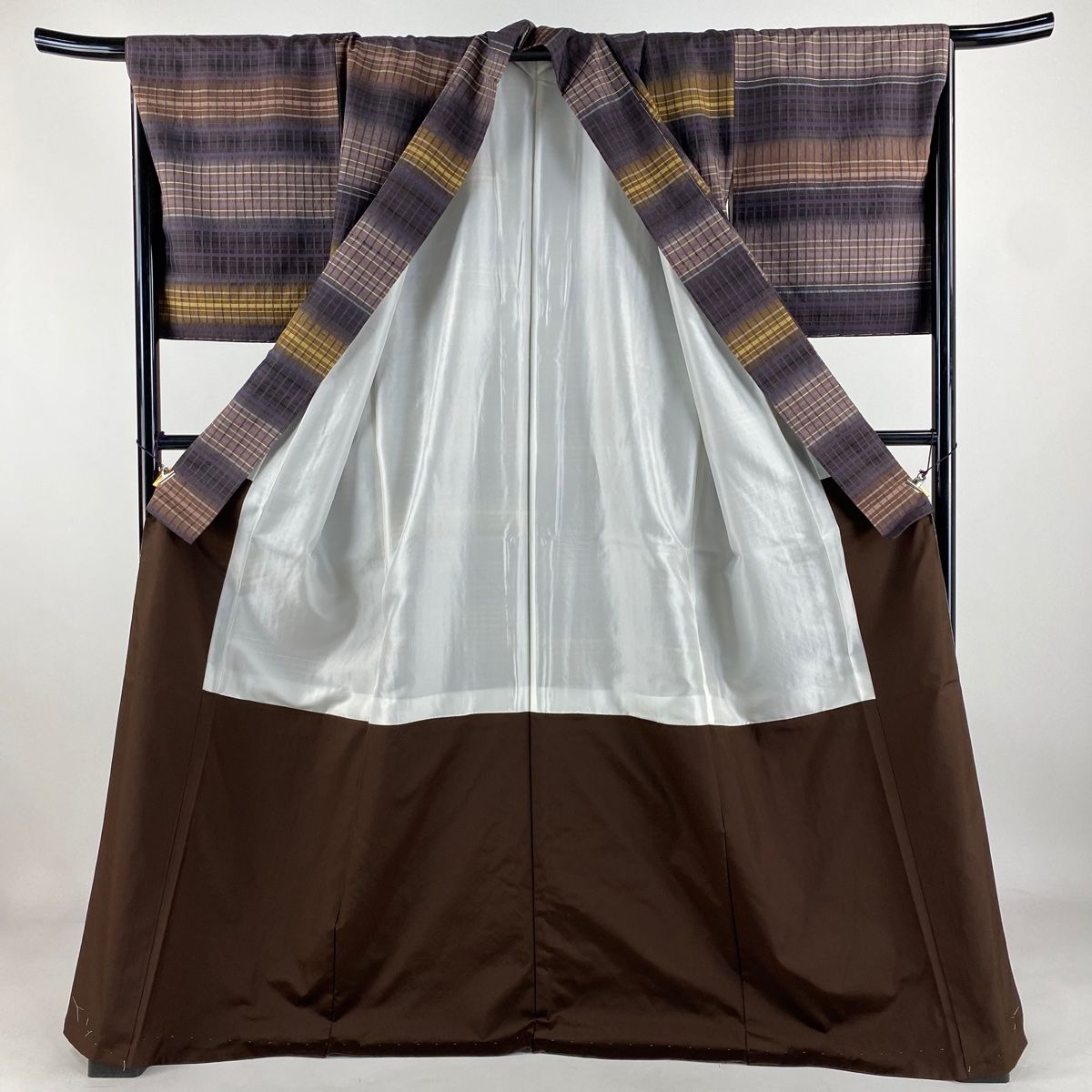 紬 身丈173 cm 裄丈69.5 L 袷 吉澤与市 証紙 格子 茶紫 正絹
