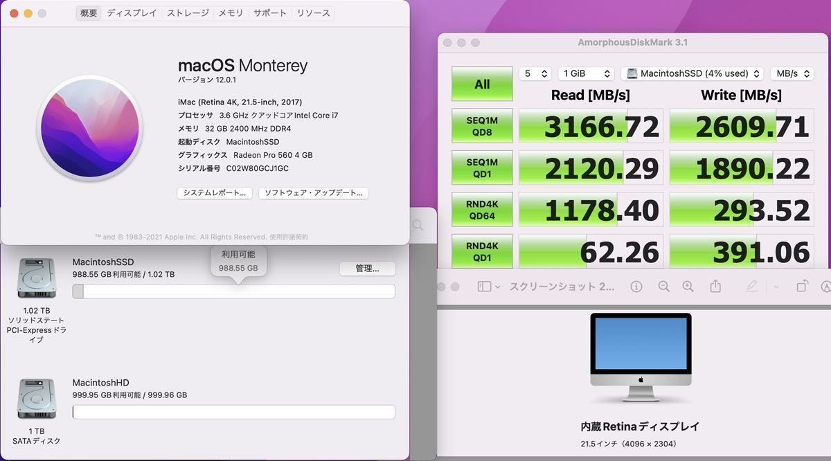 最上位 Apple iMac 21.5 inch Retina 4 K Late 2017 CPUi 7 3.6 GHZ GPU GB 32 SSD 1 TB HDD Office 2019 Windows 11