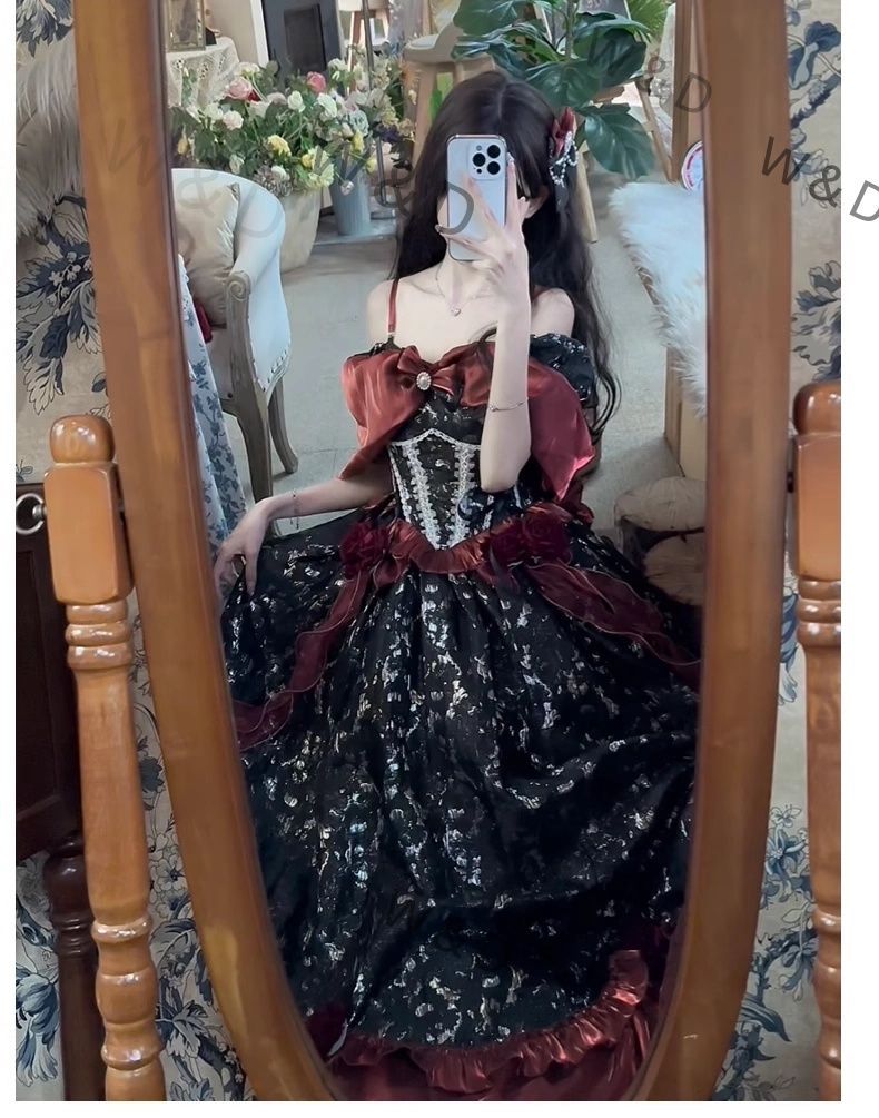 暗くも華やかなゴシックロリータの世界観を纏った、特別な日のためのフォーマルドレスです。シックな黒を基調に、妖艶な赤がアクセントとして効いた配色が、大人の女性の「可愛い」と「エレガント」を両立させます。胸元を美しく見せるオフショルダーデザインと、クラシックなシルエットが、プリンセス気分を存分に盛り上げます。高級感のある素材と精巧なレース・リボン細工にこだわり、一堂を集めるパーティーや卒業式、成人式といった晴れ舞台で、主役として輝く存在感を発揮します。日常から少し非日常な「在逃公主」になりたいときにも、この一品があなたの特別な瞬間を完璧に彩ります。
