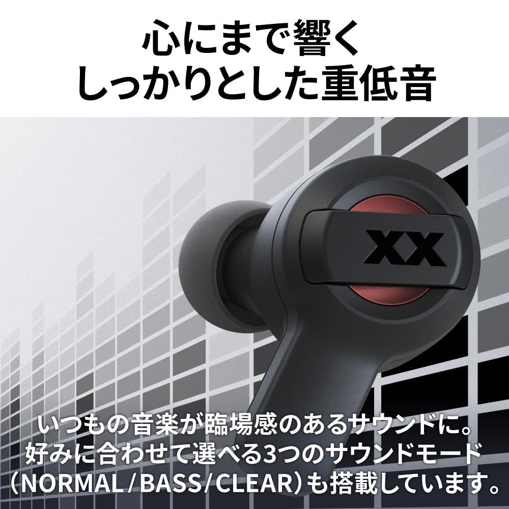 「XX」シリーズで好評の迫力の重低音を楽しめるよう、エンジニアが特別にチューニングを実施し、重低音を際立たせつつ、一つ一つの楽器やボーカルの音もクリアに楽しめるサウンドを実現。また、3つのサウンドモード(NORMAL/BASS/CLEAR)を搭載しており、モードを切り替えることで、気分や好みに合わせて、低音の増減などを調整することも可能。衝撃に強いエラストマー素材のラバープロテクターと耳にフィットしやすいスティック型を採用。イヤホン本体は片耳約4.4gと軽量で、スリムな充電ケースは鞄やポケットに収まり、持ち運びやすく便利です。ラバープロテクターによる耐衝撃に加え、IP55相当の防水※1・防塵※1を実現した「TRIPLE