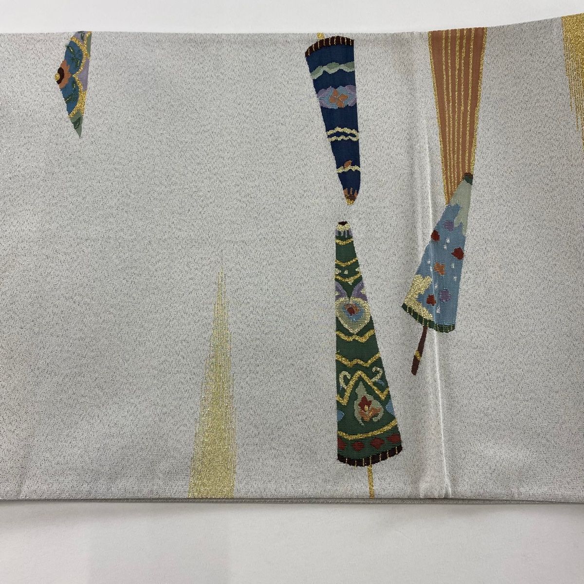 袋帯 綴れ 番傘 箔 灰白 お太鼓柄 正絹