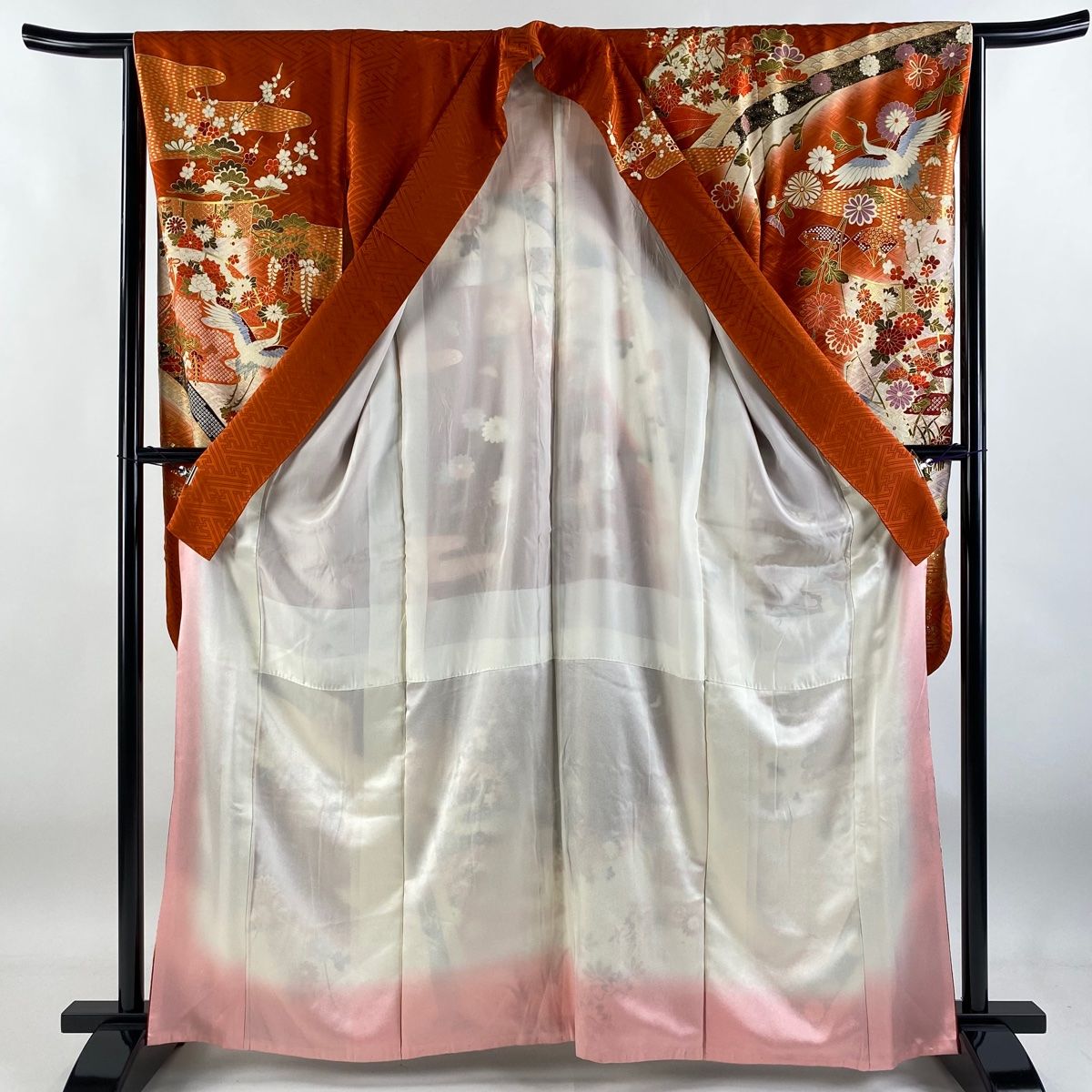 振袖 身丈164 cm 裄丈63.5 S 袷 桧扇 鶴 金糸 金彩 朱色 正絹 秀品