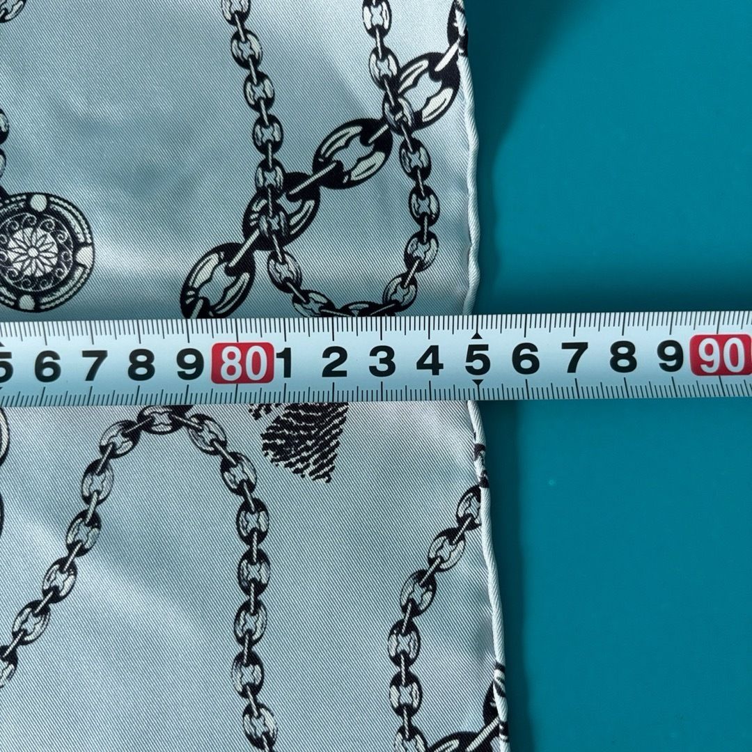 セントジョンのエレガントなチェーン・タッセル柄のシルクスカーフです。ライトブルーを基調に、ブラックとホワイトのチェーンモチーフが施された洗練されたデザインで、どのような装いにも上品さを添えます。