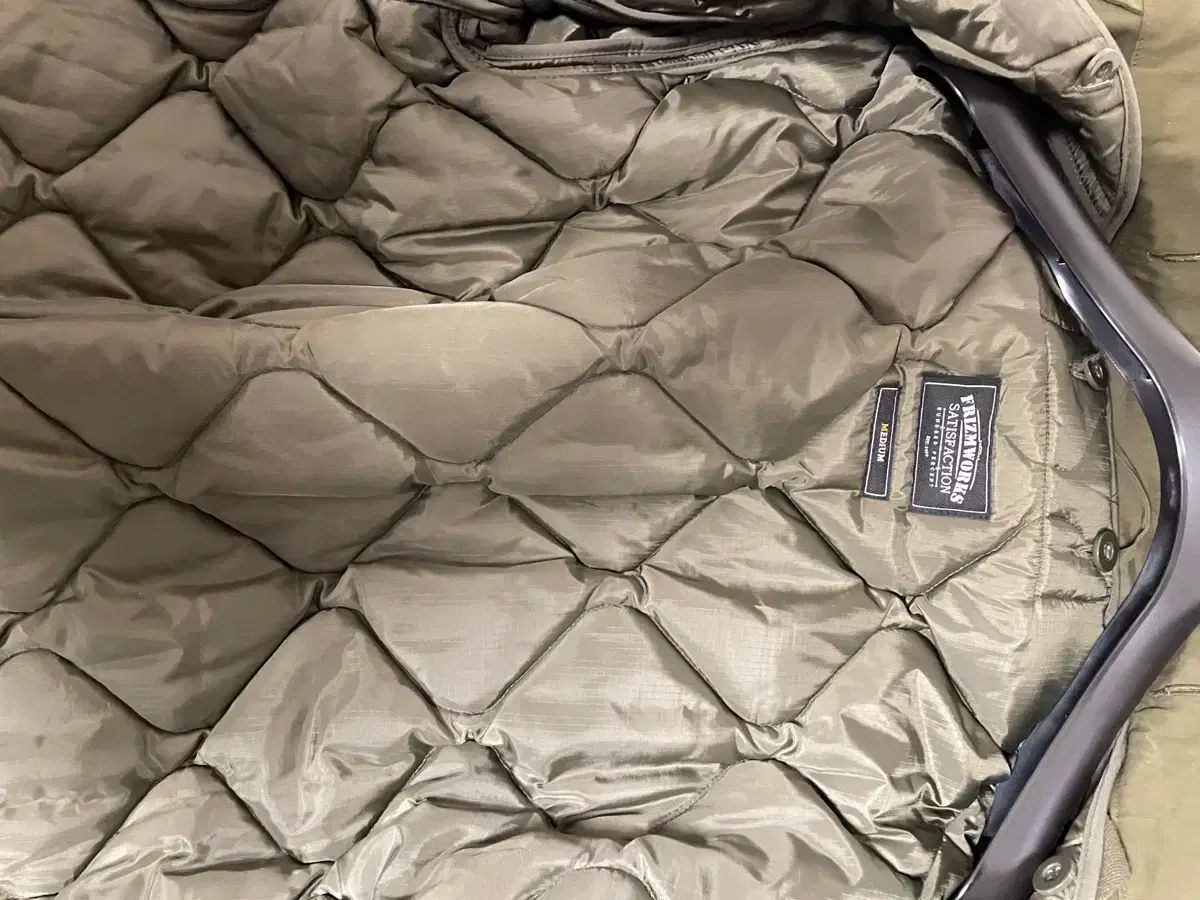 FrizmWORKS(フリズムワークス)フィッシュテールパーカー Mサイズです。カーキカラーで、裏地キルティング処理されています。実際に着用 3回した商品です。直接取引(※メルカリshop取引では対象外)の場合、送料込み(※メルカリshop取引では対象外)
