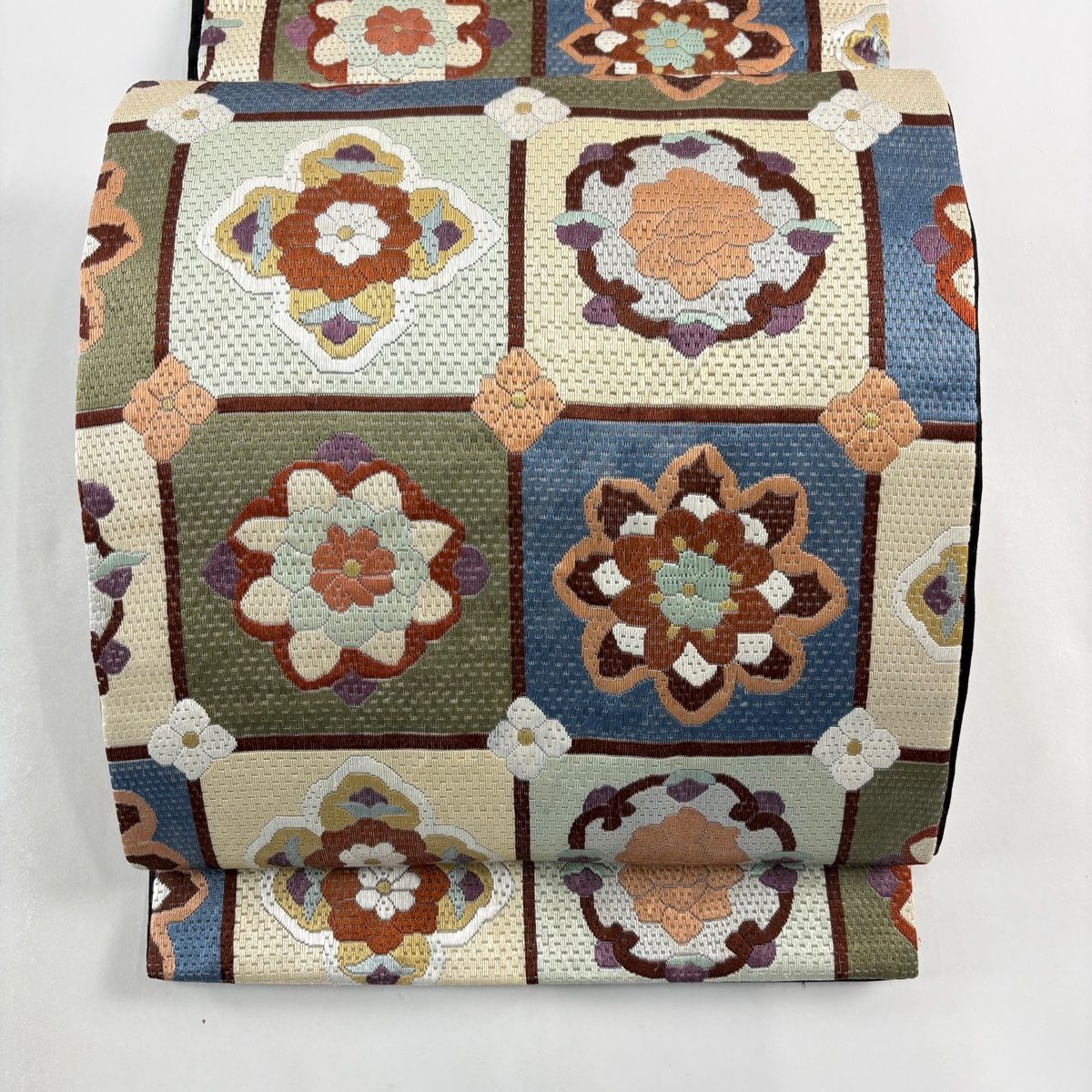 袋名古屋帯 華文 格子 絽刺し ベージュ 正絹