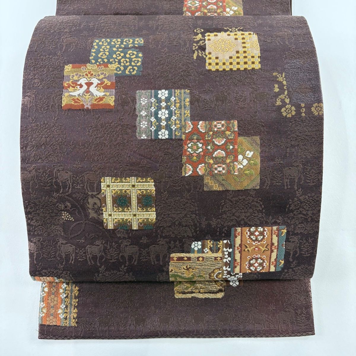 袋帯 秀品 色紙 動物 箔 金糸 茶紫 六通 正絹